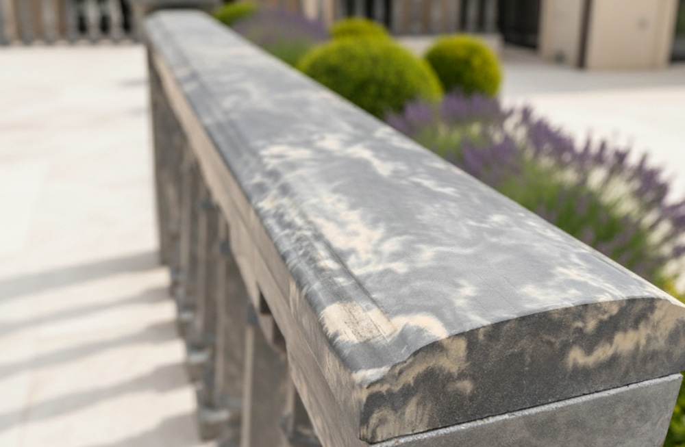 Перила для балюстрады — неотъемлемая составляющая ограждения. Устанавливается на балясины сверху, торцами крепятся к столбам или в стену при помощи анкеров. Изделия заливаются в пластиковые формы, длинной 1800 мм. Если общая длина балюстрады меньше, то просто перила отпиливаются нужной длины болгаркой по бетону. Если же общая длина больше, то перила стыкуются между собой. Остается шов, как у плитки.